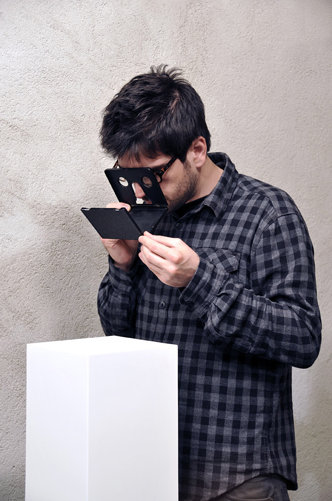 The picture is embedded into a pocket viewer produced around the end of the 1930s, placed on a lacquered MDF base: by grabbing the viewer and watching the picture through the lenses, one can enjoy the vision of a fake third dimension.