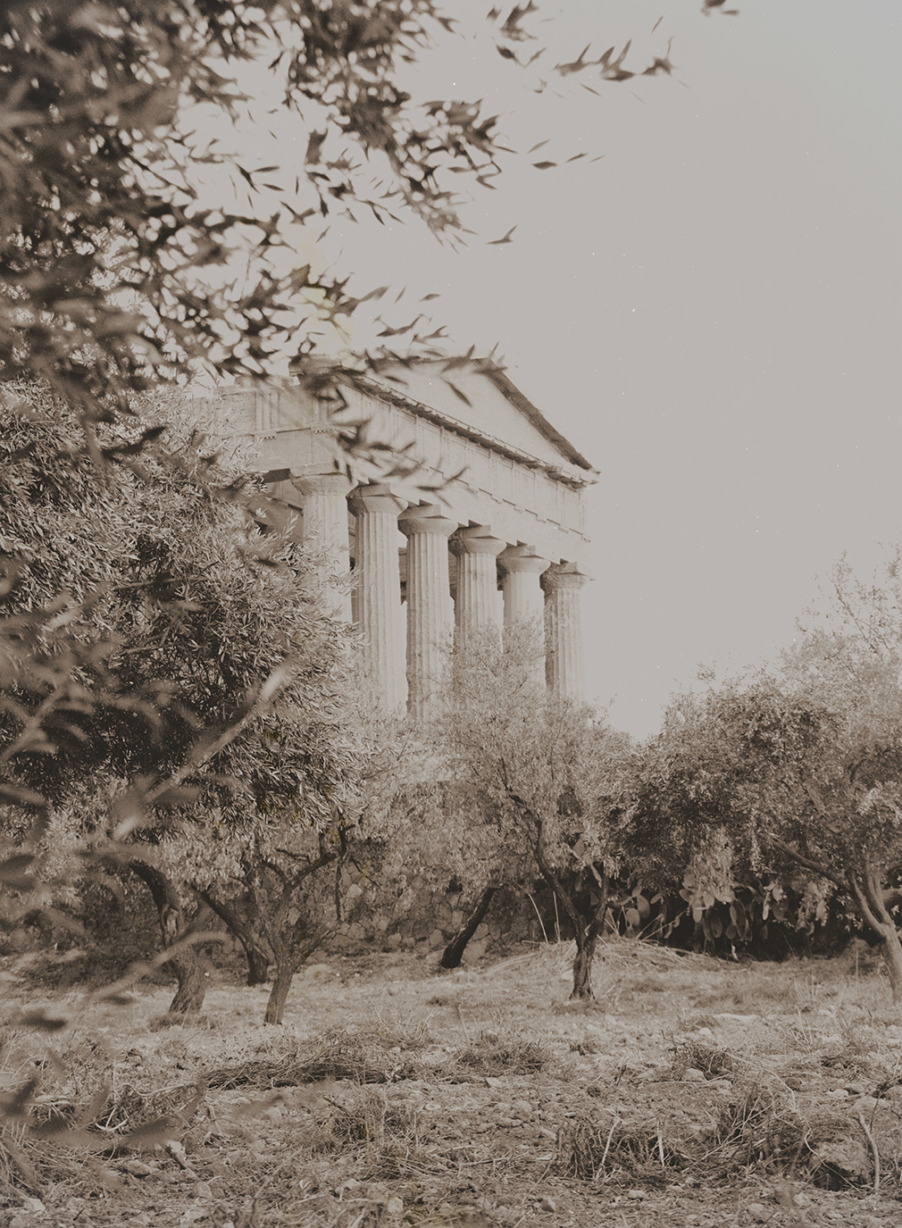Inspired by the photography of archaeological landscapes of the early 900 (Agrigento whose main exponent was Giovanni Crupi, a friend and colleague of the famous Wilhelm Von Gloeden), I wanted to bring back to life the dream of the English captain recreating a visual diary made up exclusively of by nostalgic sepia images. The illusory nature of photography and alienating here is accentuated by the mimesis of the visual language of the time, conducted through a chromatic effect of aging.